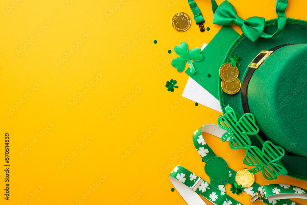 Top view photo of St Patrick's Day accessories leprechaun hat suspenders gold coins envelope letter clovers trefoil shaped party glasses bow-tie confetti on isolated yellow background with copyspace