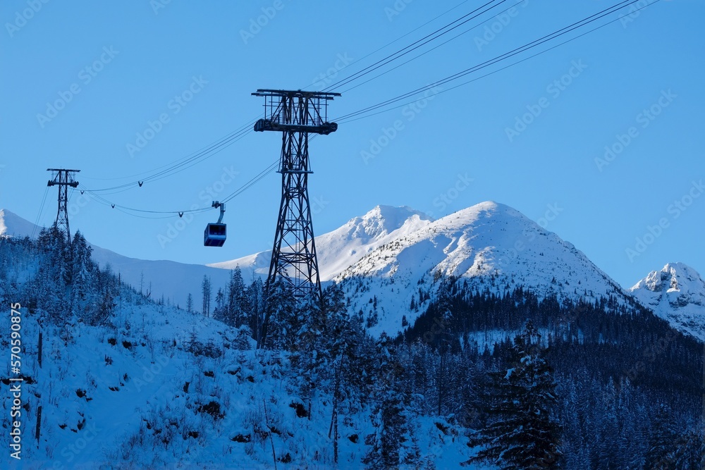 Ropeway to Kasprowy Wierch Peak in Tatras Mountains in beautiful winter scenery in morning light, famous place in Tatras, Poland. Tatra National Park