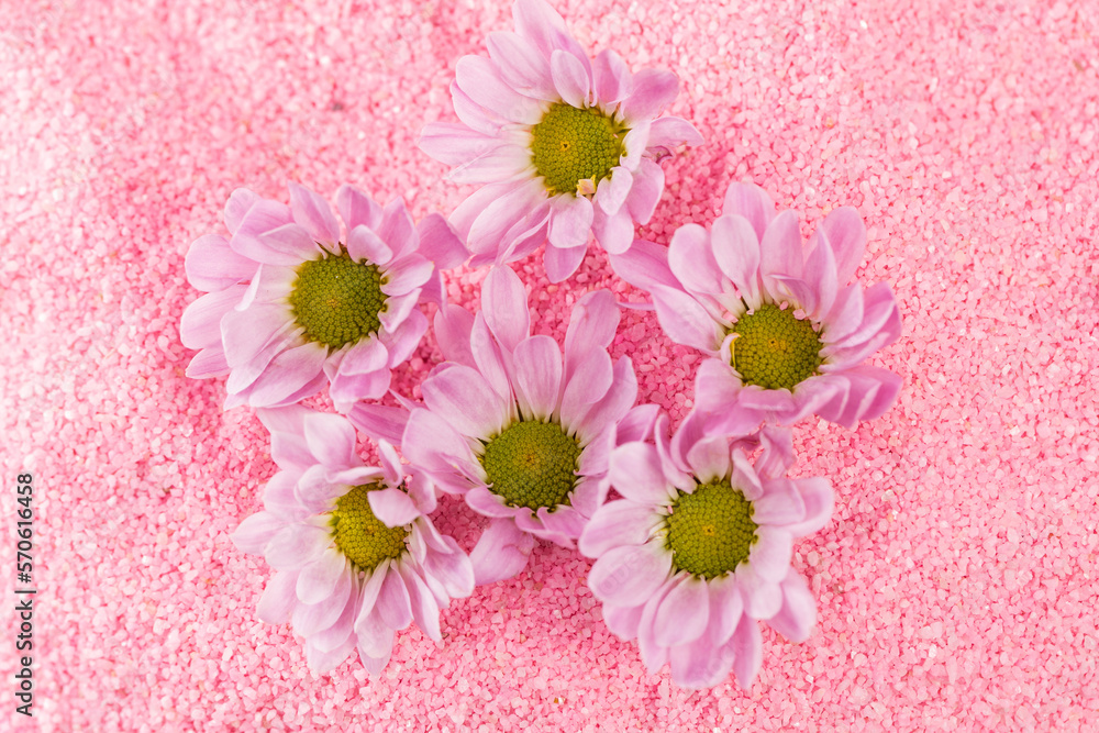 Pretty chrysanthemums on pink sand