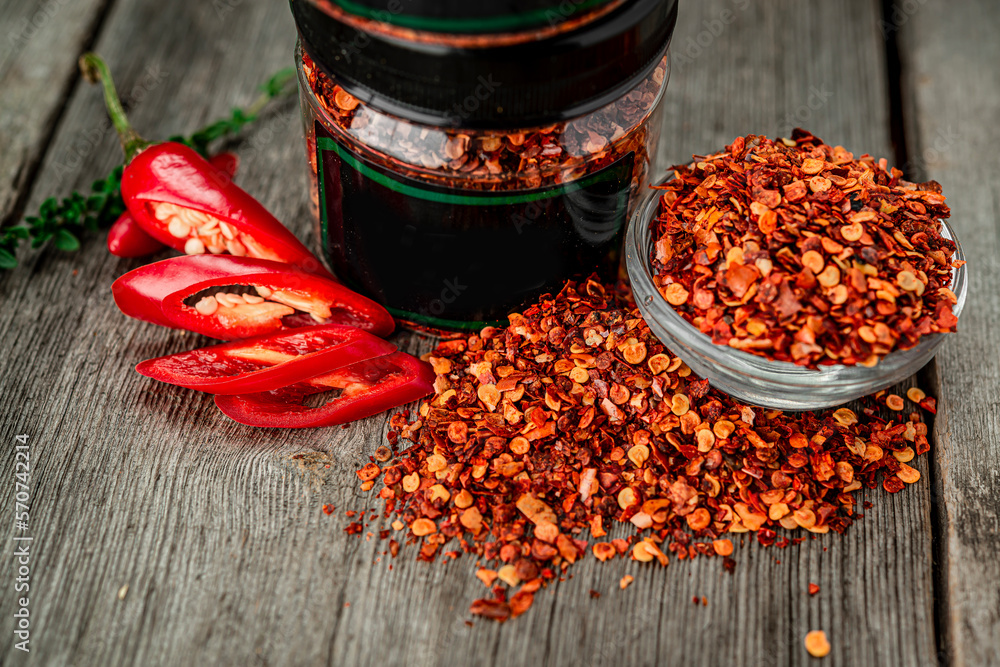 Dried chili peppers packed for sale. Dried spices.