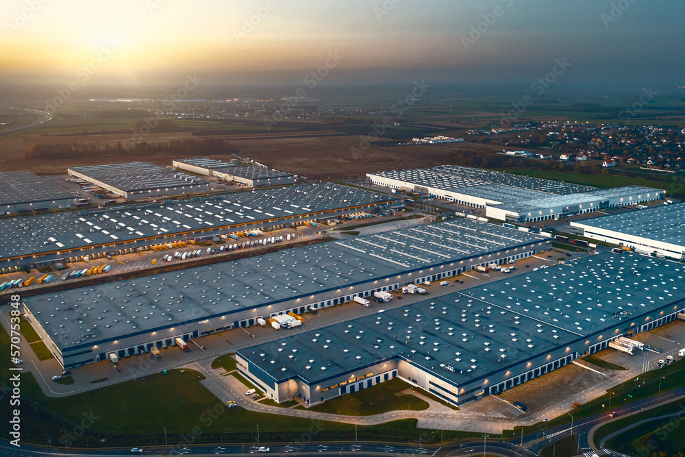 Top view of warehouses, aerial view of large logistics warehouses in the evening