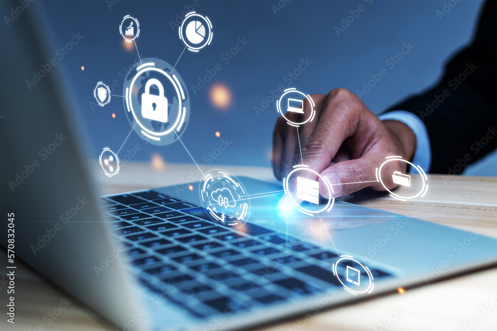 Cyber Security. business man hand working on laptop computer with virtual graphic icon diagram on desk at office, contact us, digital marketing, business finance, internet network technology concept