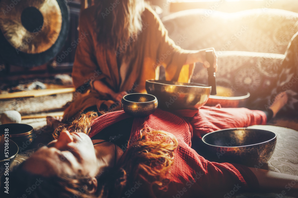 beautiful woman playng on tibetan bowl. Woman on music therapy. ceremonial space.