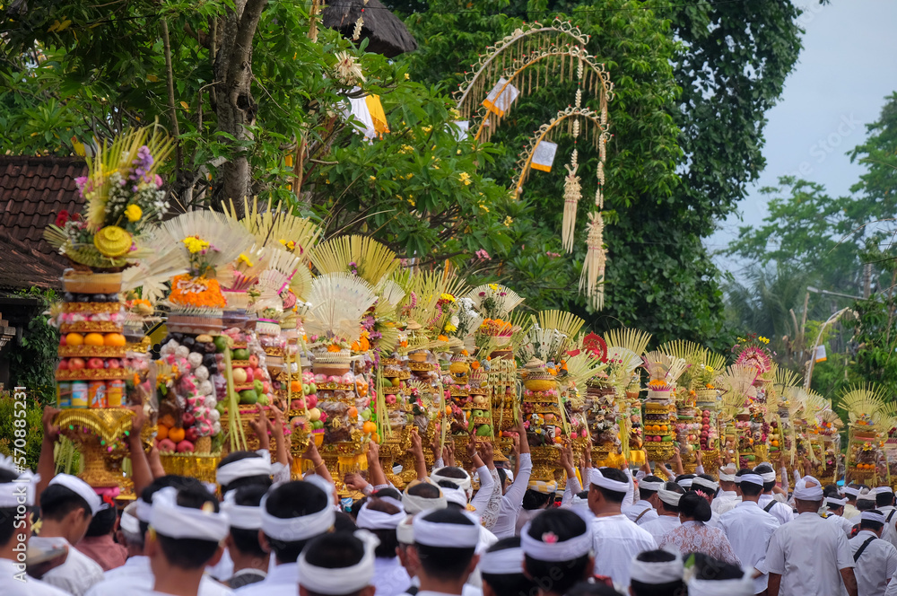 Balinese women brings gebogan when the mepeed tradition is at the village temple
