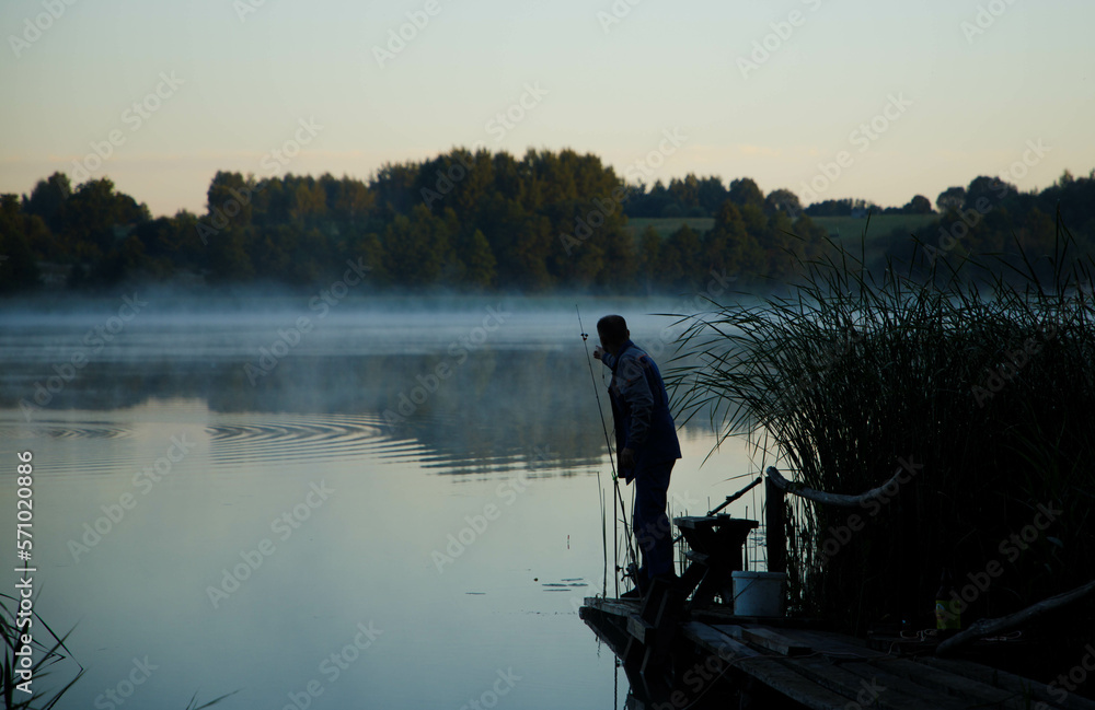 Fisherman at dawn, foggy lake, dark time of day.