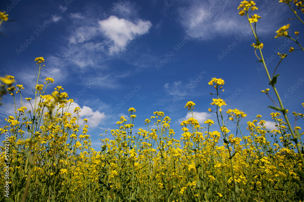 A blooming field of bright yellow flowers, blue bright sky.