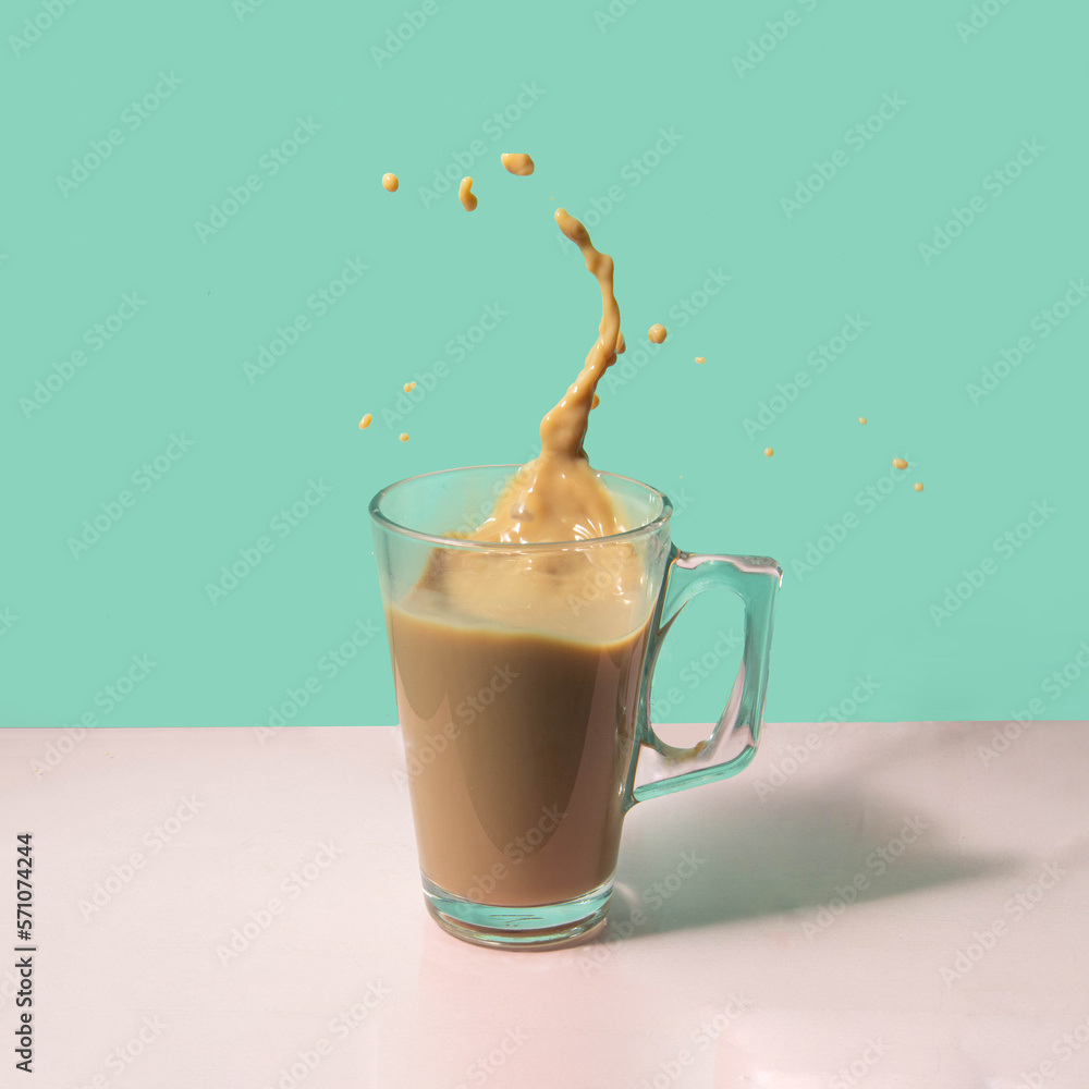 Coffee drink on pastel light pink and mint background. Creative ' take a break ' concept. Minimalistic beverage composition. Summer relax time idea.