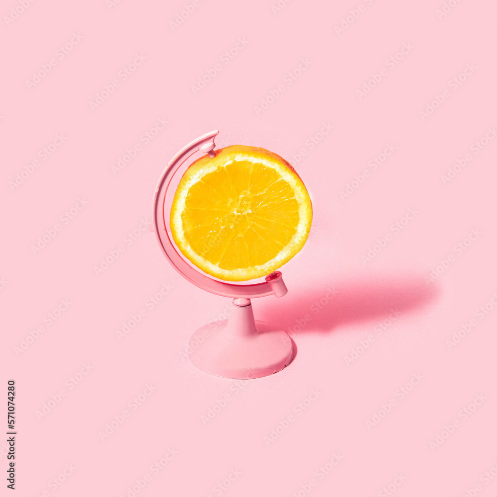 Monochromatic fruit concept. Orange slice as globe on pastel light pink background. Minimalistic juicy food composition. Creative summer nature idea.