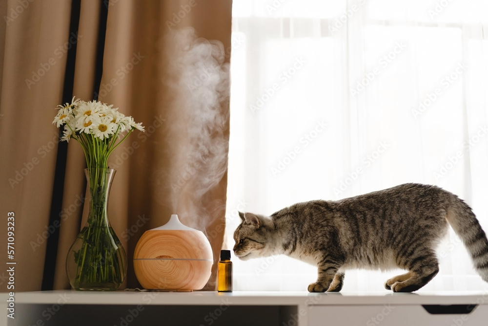 Aromatherapy concept. Aroma oil diffuser with cat on the table against the window. Air freshener. Ultrasonic aroma diffuser for home
