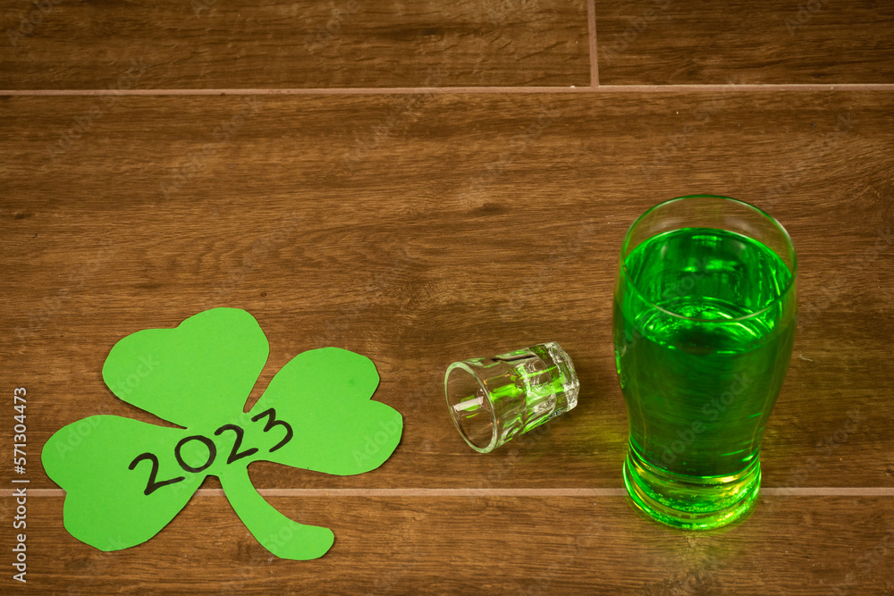 shot and pint glasses on wooden bar background filled with green spirit cocktail and shamrock, drunk at celebration for St Patrick's day 2023. Irish holiday popular drinking event when people party