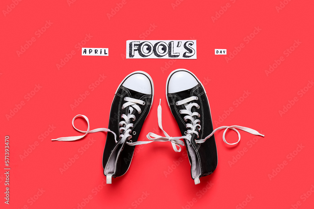 Composition with pair of shoes and text APRIL FOOL'S DAY on red background