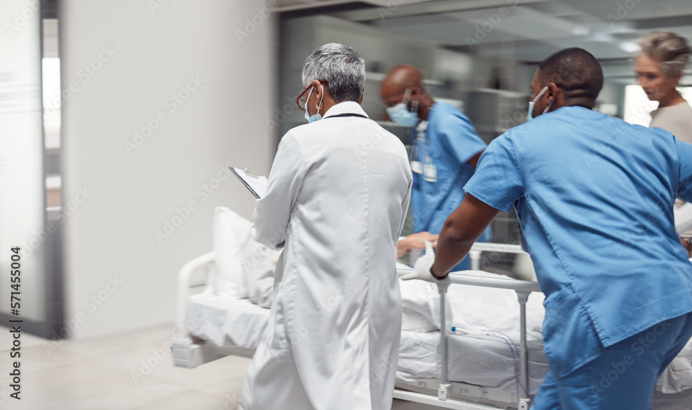 Busy, healthcare and doctors rush with patient, surgery and ready for procedure in hospital. Fast team, medical professional and staff with emergency, accident and health with wellness and nurses