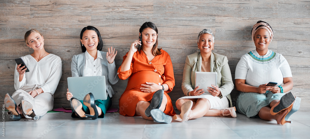 Creative business people, portrait smile and networking sitting together on floor at office. Happy group of employee women smiling with technology in team hiring, welcome or management for startup