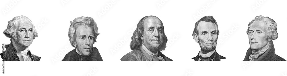Washington, Jackson, Franklin, Lincoln, Hamilton. Portraits made from money isolated on white.