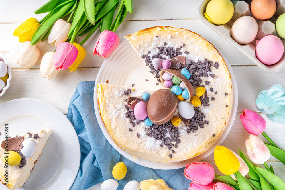 Homemade Easter cheesecake, sweet cottage cheese baking, with Easter chocolate eggs and chocolate drops, with holiday decorations and spring flowers