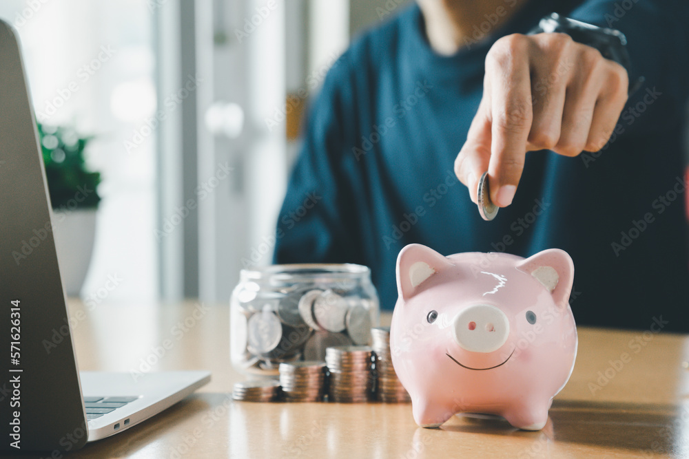 Hand putting coins in a piggy bank for save money and Saving Money concept.