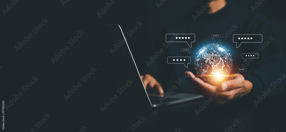 Chatbot chat AI concept, artificial intelligence Businessman using AI smart robot technology inputting commands to analyze data and build something. future technology changes.
