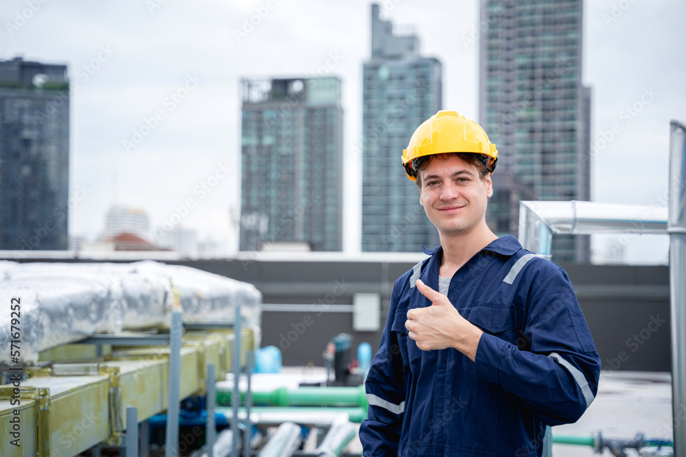 The engineer is inspecting the cooling tower air conditioner in a large industrial building to manage the airflow.