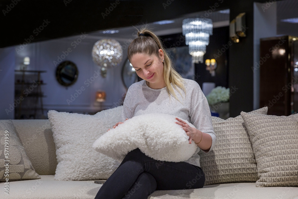 Smiling young woman is sitting on a sofa in a furniture store with a fluffy decorative pillow made of astrakhan in her hands. Interior design and decor.