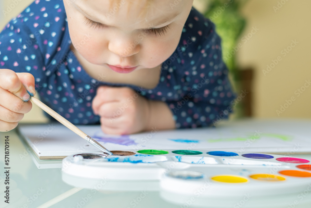 Cute little Girl painting picture on home interior background. Cute Little toddler girl drawing.