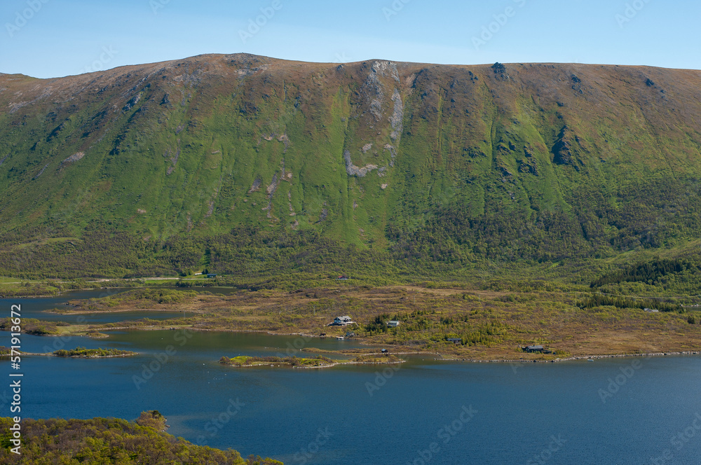 Remote country houses in North of Norway. Just under mountain, sea coast, fjord