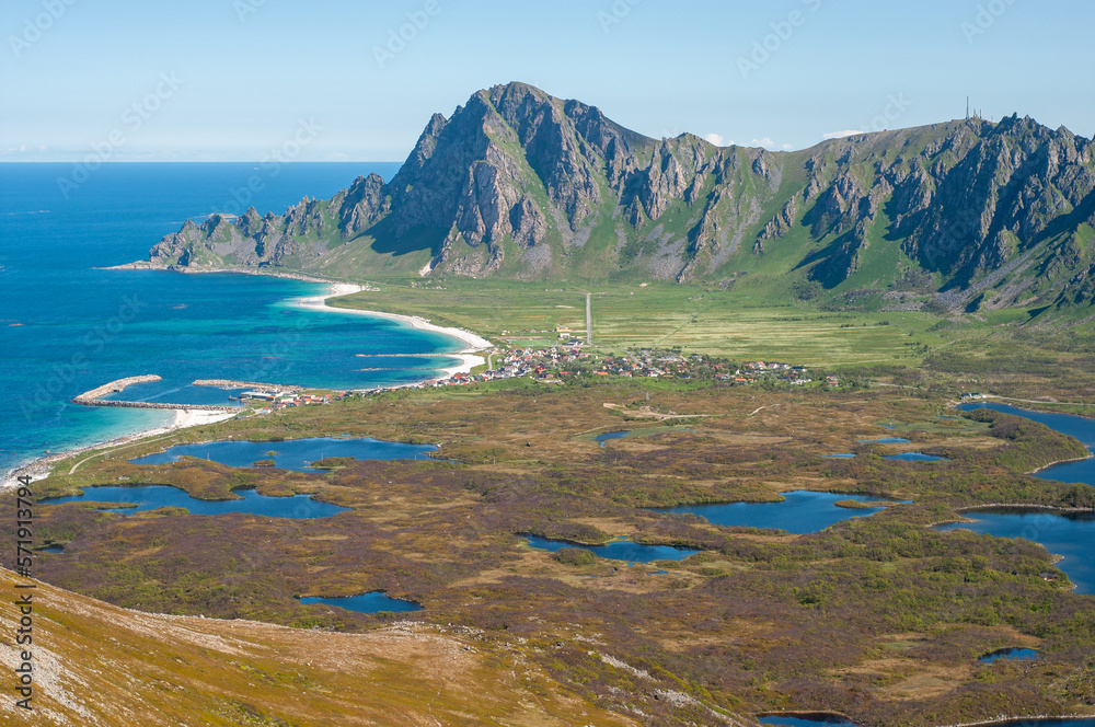 View to small village in North Norway from hill. Mountain, fjord, sea