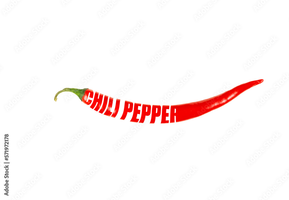 Single red chili pepper fruit with writing "chili pepper" inside the fruit. Photo isolated on white background.