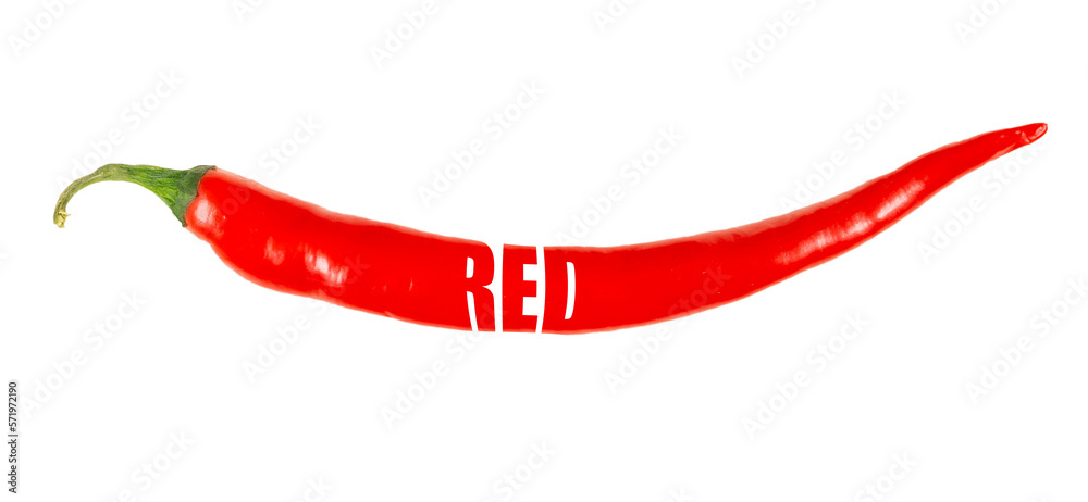 Single red chili pepper fruit with writing "red" inside the fruit. Photo isolated on white background.