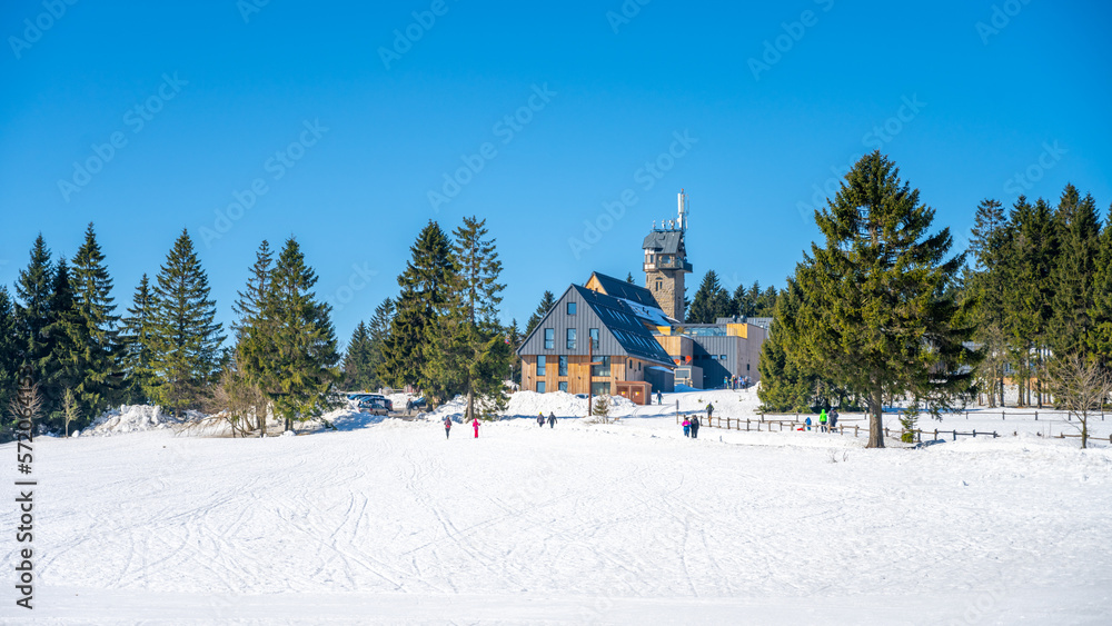 Sunny winter day at Kralovka Lookout and Mountain Hut, located near Bedrichov in the picturesque Jizera Mountains. Beautiful snowy landscape and cross-country skiers on the snowy plain below. Great