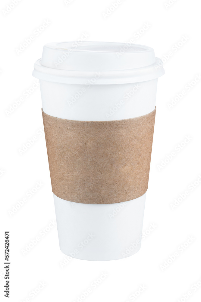 Takeaway paper coffee cup with brown sleeve isolated on white. Full Depth of field. Focus stacking. PNG