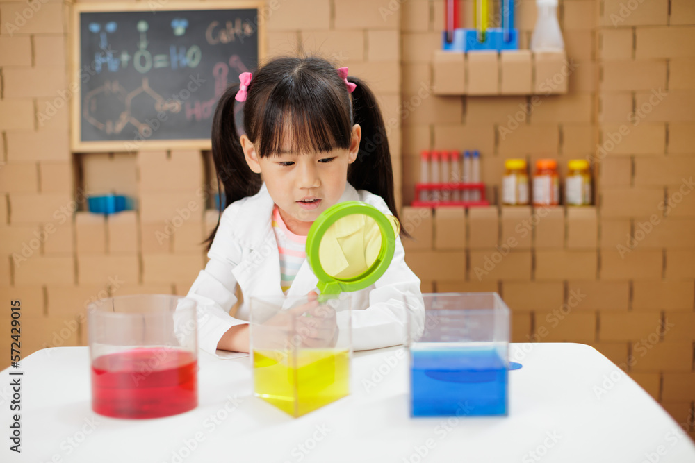 young girl plays science experiment for home schooling