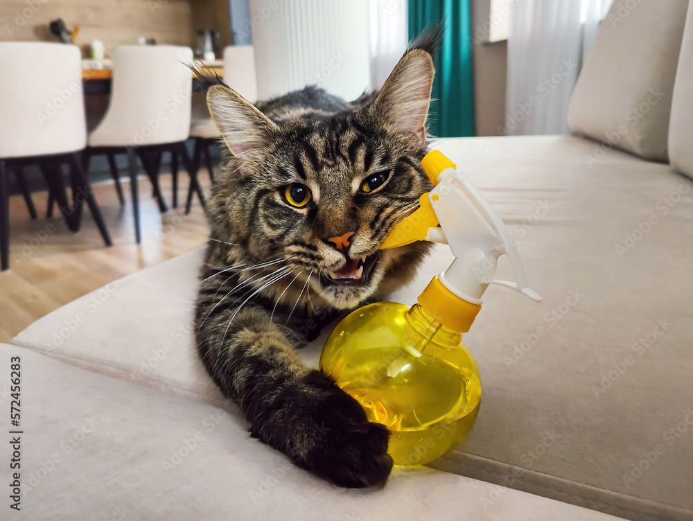 Maine coon cat gnaws spray bottle with water laying on sofa