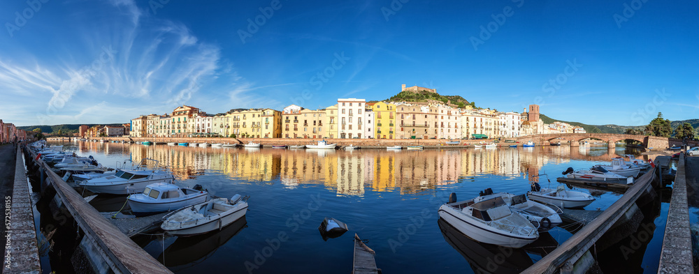 River with Homes and Apartments in Touristic Town. Bosa, Sardinia, Italy. Sunny Fall Season Day. Panorama