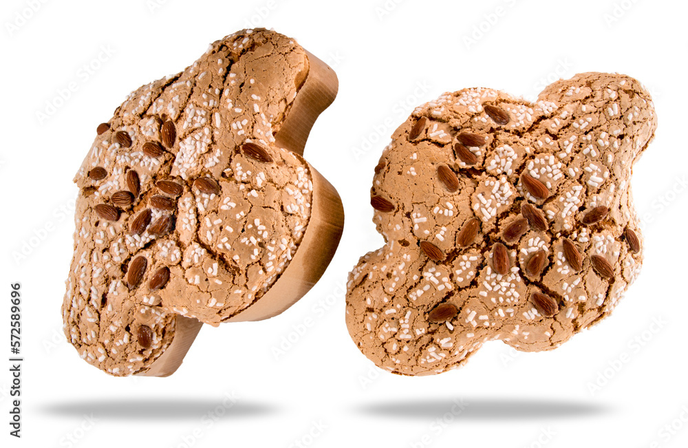 Colomba Pasquale cake, traditional Italian Easter dove with glazed sugar and almonds on top. two cakes cut out