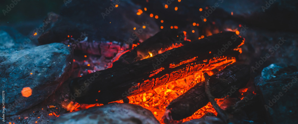 Vivid smoldered firewoods burned in fire closeup. Atmospheric background with orange flame of campfire. Wonderful full frame image of bonfire with glowing embers in air. Warm logs, bright sparks bokeh