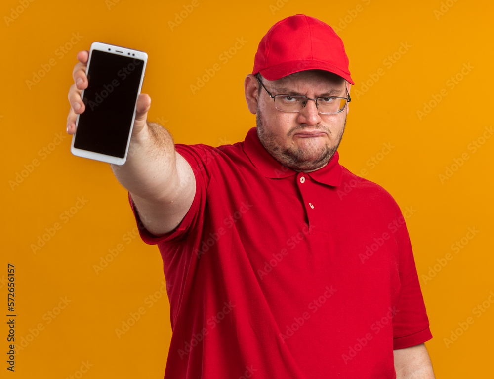unpleased overweight young deliveryman in optical glasses holding phone isolated on orange background with copy space