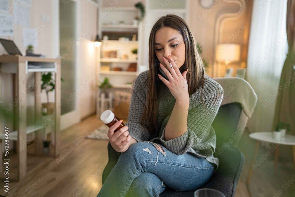 One woman young caucasian female hold medicine drugs pills tablets while siting at home smoke cigarette thinking trying to quit smoking real person copy space