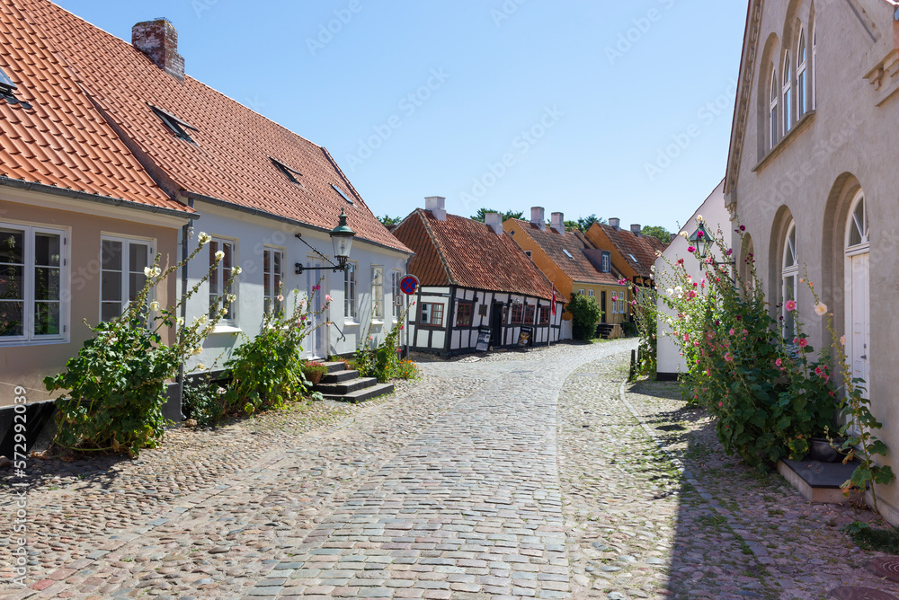 Bunte Fassaden und Stockrosen in den Gassen der Altstadt von Ebeltoft, Djursland, Dänemark in der Sonne vor blauem Himmel