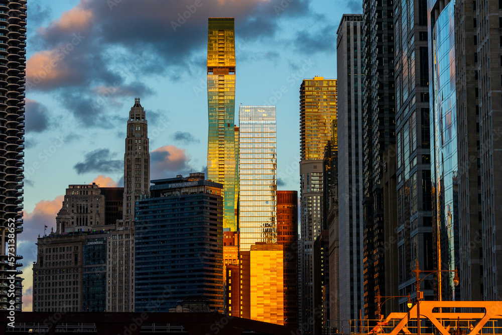 Chicago, Il USA September 17th 2022: establishing shot of downtown Chicago during sunset and the equinox. the street lights glow yellow along with the orange in the skies with the city architecture.