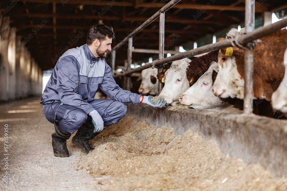 A farmer is feeding cows in barn. Livestock and agriculture concept.