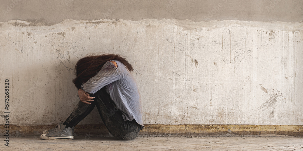 depression sad alone woman sit in dirty abandon building after raped violence against by bandit. Raped girl sit and cry in scared depressed emotion.