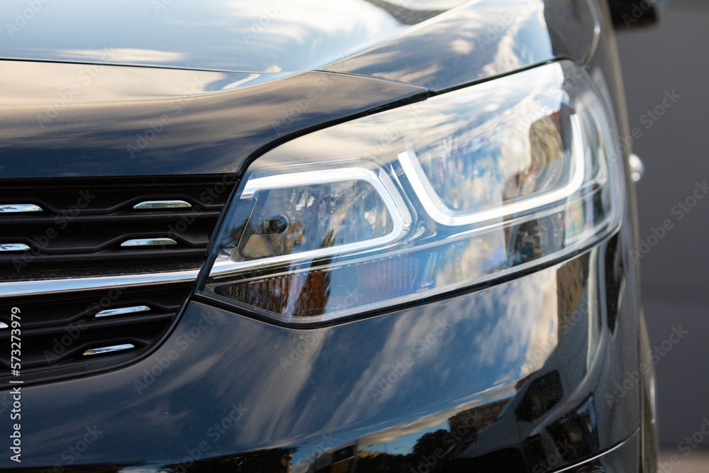 Detail of the headlight of a current car, showroom, for sale at a car dealership in Madrid, Spain