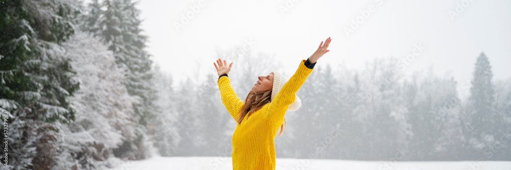 Young woman celebrating life standing in winter nature