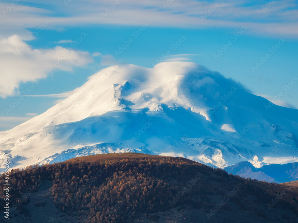 Snowy peak. Scenic landscape with snowy mountain peak in sunny day. Awesome landscape with rocky pinnacle with snow in sunlight. Beautiful view to snow mountain top of Elbrus.