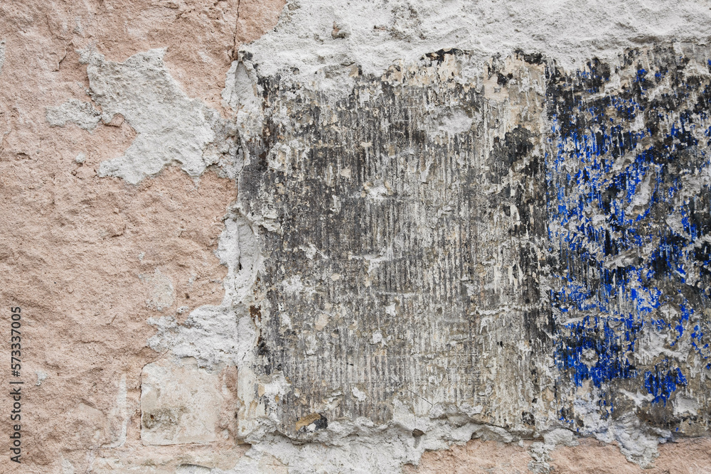 Cracked and damaged cement wall with different colors, like blue, grey, black and white, no person, vertical format