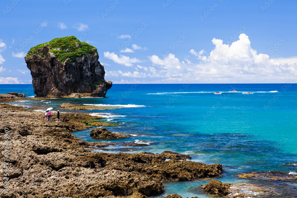 Chuanfan Rock coastal reef and sea waves with the azure sky in the Kenting National Park of Pingtung, Taiwan.