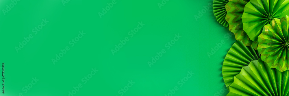 St Patrick flatlay background with shamrock clover leaves, leprechaun hat decor, golden coin, party accessories, symbols of Patrick day