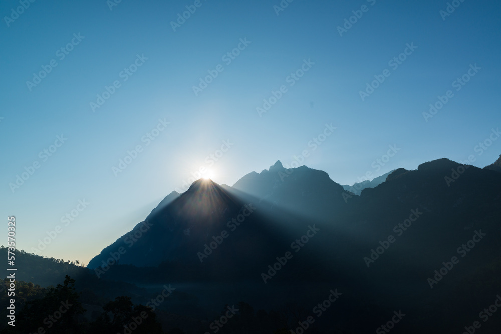 The morning sun shines from the back of Doi Luang Chiang Dao mountain when seen from Ban Na Lao Mai, Chiang Dao, Chiang Mai, Thailand.