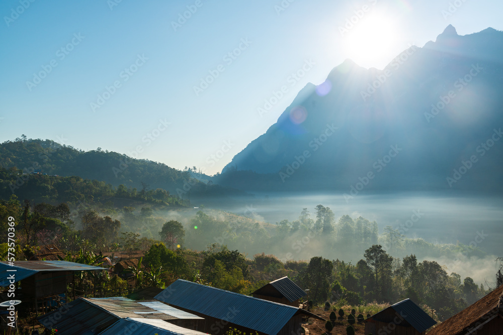 Panoramic view of Doi Luang Chiang Dao, (Doi Chiang Dao) is the third highest peak mountain in Thailand while morning mist flows through the valley area, Chiang Dao District, Chiang Mai, Thailand.