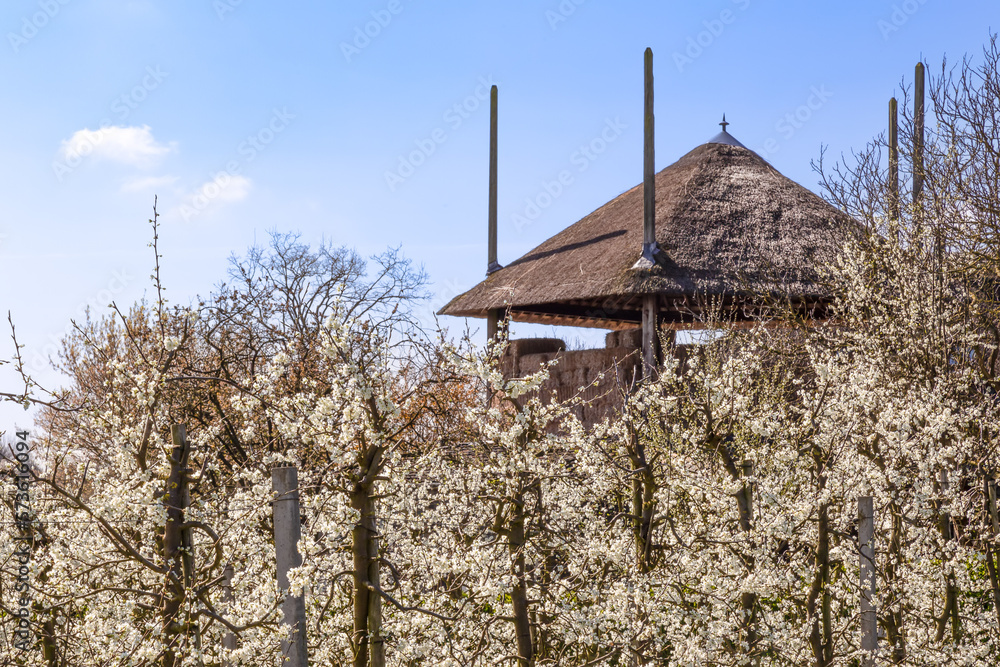 Flowering fruit trees in the Betuwe with a hay barn in the background.